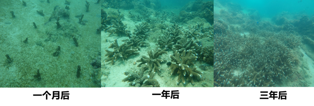 珊瑚礁修复区域三年内变化。中国科学院南海海洋研究所供图